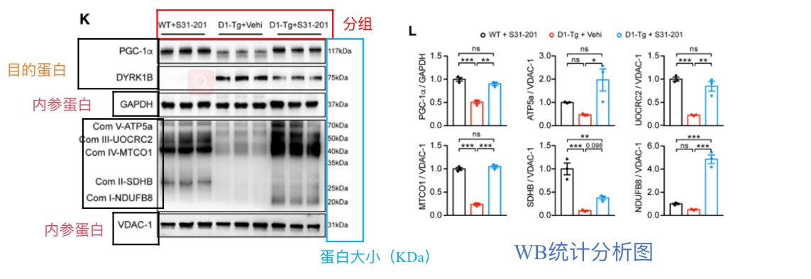 圖上結(jié)果解讀:D1-Tg+Vehi組PGC1a的表達(dá)相較于對照組WT+S31-201的表達(dá)顯著降低,降低大概0.5倍,其余解讀類似