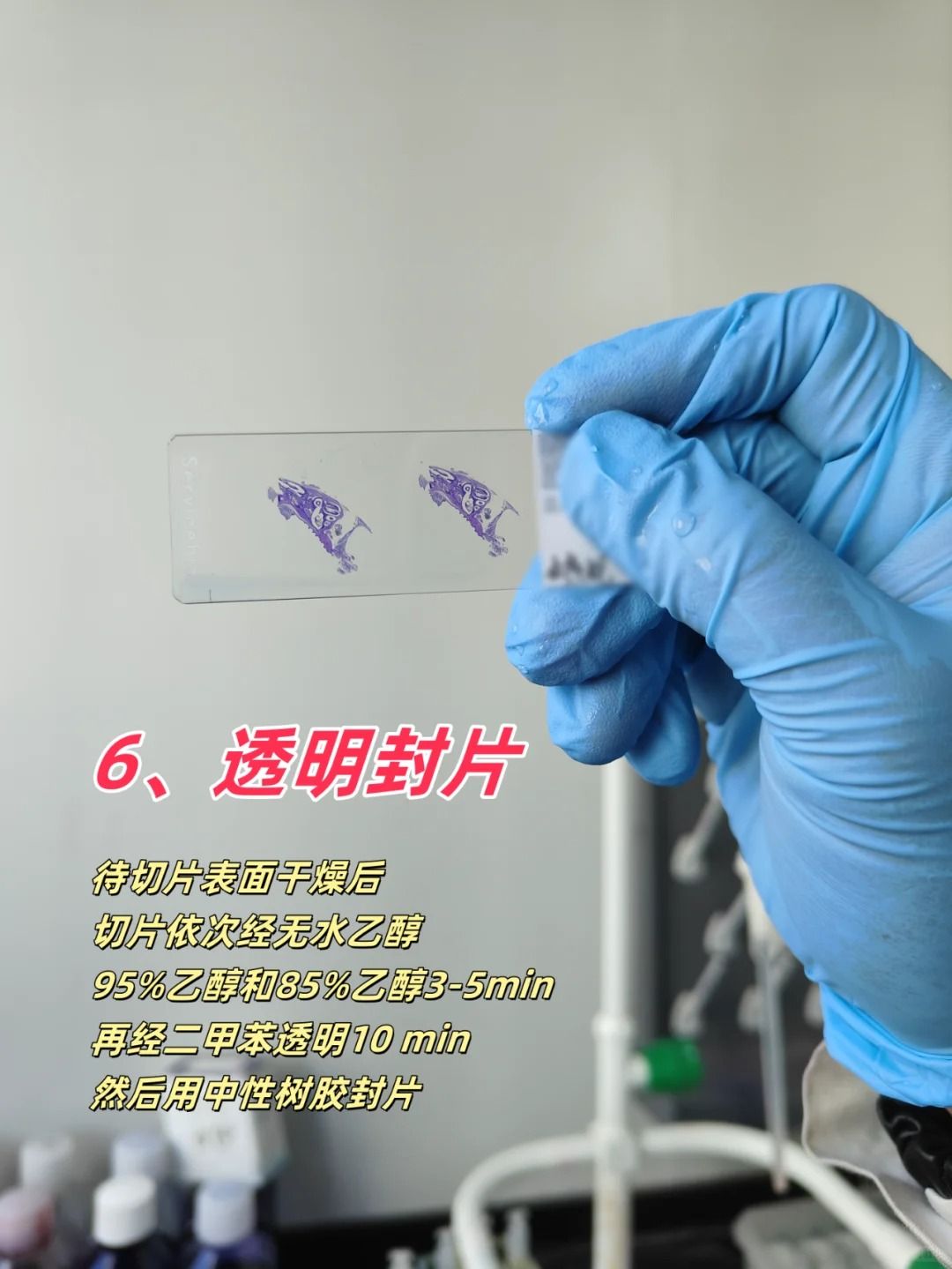 Step12:在石蠟切片的中央滴加一滴中性樹膠,然后蓋上蓋玻片進行封固。封片時要避免產(chǎn)生氣泡,以免影響觀察效果。