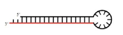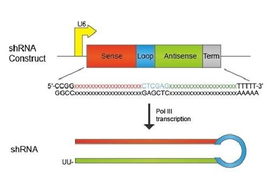 短發(fā)夾RNA(short hairpin RNA,簡稱shRNA)是一種具有環(huán)狀結(jié)構(gòu)的RNA分子。shRNA由兩個(gè)短反向重復(fù)序列和一個(gè)中間的莖環(huán)(loop)序列組成,整體呈發(fā)夾狀結(jié)構(gòu)。shRNA通常由pol Ⅲ啟動子控制轉(zhuǎn)錄。