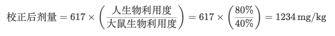 示例:延續(xù)上面的示例,剛剛我們計算出大鼠理論劑量是617mg/kg,假設(shè)目標藥物在人體的口服生物利用度為80%,而在大鼠中僅為40%,生物利用度校正的計算過程如下: