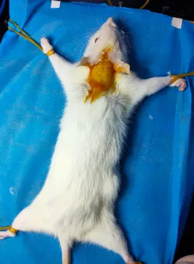 3、待大鼠麻醉后采取仰臥位固定于操作臺。
