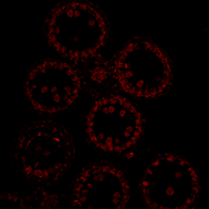 組織中有細(xì)胞凋亡,全細(xì)胞背景為紅色熒光,凋亡部位為綠色熒光(Merge后呈黃色)