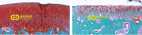 番紅固綠染色原理:改良番紅O-固綠軟骨染色法的染色原理在于嗜堿性的軟骨與堿性染料番紅O結(jié)合呈現(xiàn)紅色,嗜酸性的骨和酸性染料固綠結(jié)合而成綠色或藍色,與呈現(xiàn)紅色的軟骨對比鮮明,從而將軟骨組織和骨組織區(qū)分開。番紅O是一種結(jié)合多陰離子的陽離子染料,其顯示軟骨組織是基于陽離子染料與多糖中陰離子基團(硫酸軟骨素或硫酸角質(zhì)素)結(jié)合。番紅O著色與陰離子的濃度近似成正比關(guān)系,間接反映了基質(zhì)中蛋白多糖的含量和分布。當軟骨受到損傷時,軟骨中的糖蛋白會釋放出來,使基質(zhì)成分分布不均勻,從而導致番紅O淡染或不著色。通過圖像分析軟件可對番紅O染色的軟骨基質(zhì)進行定量分析。