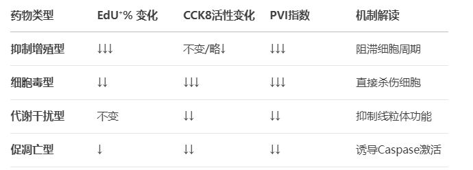 單一檢測指標(biāo)常導(dǎo)致假陽性/假陰性誤判——CCK8僅反映代謝活性,無法區(qū)分靜息細(xì)胞;EdU只標(biāo)記DNA合成,可能漏檢凋亡干擾。普拉特澤生物開發(fā)的EdU-CCK8雙軌驗(yàn)證方案,可在96/384孔板中同步解析細(xì)胞真實(shí)增殖狀態(tài)與存活率,精準(zhǔn)識別抑制增殖型、細(xì)胞毒型、代謝干擾型藥物,誤判率降低90%