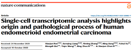 那么如何提升單細(xì)胞測(cè)序技術(shù)的發(fā)文水平,為國(guó)自課題的申報(bào)助力呢?今天小編給大家提供一個(gè)研究案例,來(lái)自2022年10月22日,上海復(fù)旦大學(xué)陳曉軍/趙冰合作課題組在《Nature Communications》期刊上發(fā)表的關(guān)于人子宮內(nèi)膜樣癌的起源和病理過(guò)程的研究。該研究團(tuán)隊(duì)通過(guò)單細(xì)胞轉(zhuǎn)錄組學(xué)分析繪制了人類正常子宮內(nèi)膜向子宮內(nèi)膜癌轉(zhuǎn)變過(guò)程中不同細(xì)胞亞群細(xì)胞的動(dòng)態(tài)圖譜。