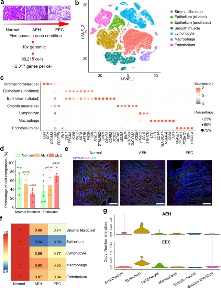 子宮內(nèi)膜癌(EC)是繼宮頸癌后第二常見(jiàn)的婦科惡性腫瘤之一,是發(fā)生于子宮內(nèi)膜的一種上皮性惡性腫瘤,子宮內(nèi)膜樣癌(EEC)是EC的主要病理特征。在EEC腫瘤發(fā)生中,子宮內(nèi)膜缺乏孕酮的保護(hù),長(zhǎng)期暴露于雌激素刺激下發(fā)生惡性增殖,正常子宮內(nèi)膜逐漸發(fā)展為非典型子宮內(nèi)膜增生(EEC癌前階段)。關(guān)于EEC來(lái)源和正常子宮內(nèi)膜向EEC演化過(guò)程中細(xì)胞亞群動(dòng)態(tài)變化尚不清楚。因此,該研究通過(guò)單細(xì)胞轉(zhuǎn)錄組測(cè)序分析確定EEC的來(lái)源及發(fā)生過(guò)程中細(xì)胞亞群的動(dòng)態(tài)變化,為子宮內(nèi)膜癌的診斷和治療提供新的方向。一、EEC很可能來(lái)源于子宮內(nèi)膜上皮細(xì)胞而非基質(zhì)細(xì)胞