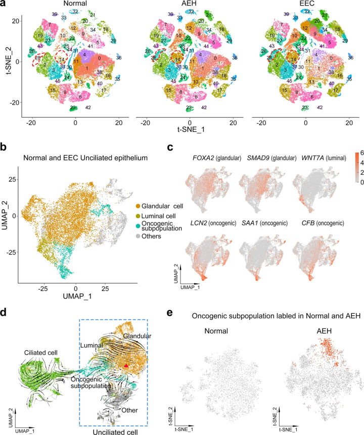 通過(guò)研究RNA速度分析預(yù)測(cè)細(xì)胞的發(fā)展軌跡發(fā)現(xiàn)無(wú)纖毛的腺細(xì)胞到致癌亞群有強(qiáng)烈的方向性流動(dòng),表明致癌亞群的來(lái)源最可能是無(wú)纖毛的腺細(xì)胞,充分證明AEH為EEC的前驅(qū)病變。表明獨(dú)特的無(wú)纖毛上皮細(xì)胞亞群的出現(xiàn)是子宮內(nèi)膜癌發(fā)生的關(guān)鍵步驟。
