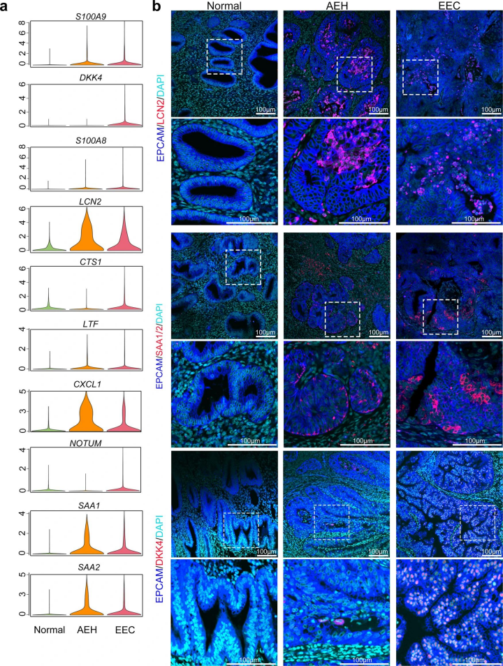 該研究通過(guò)對(duì)比子宮內(nèi)膜病變不同階段的免疫熒光染色證實(shí),EPCAM + /LCN2 +和SAA1/2細(xì)胞出現(xiàn)在AEH和EEC樣本中,但在正常子宮內(nèi)膜中未出現(xiàn),因此LCN2+/SAA1/2+上皮細(xì)胞亞群是EEC的早期標(biāo)志物。