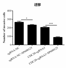 通過(guò)Transwell實(shí)驗(yàn)檢測(cè)Hela細(xì)胞轉(zhuǎn)染CDC20-sgRNA3或SP600125處理后其遷移能力的變化。