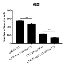 通過Transwell實(shí)驗(yàn)檢測Hela細(xì)胞轉(zhuǎn)染CDC20-sgRNA3或SP600125處理后其侵襲能力的變化。