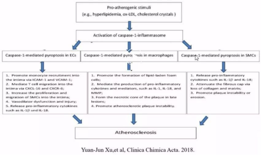 1、在動(dòng)脈粥樣硬化的發(fā)展中,炎癥被認(rèn)為是啟動(dòng)和驅(qū)動(dòng)動(dòng)脈粥樣硬化的主要因素。在高血脂,氧化修飾的低密度脂蛋白等幾次下,激活Caspase-1,介導(dǎo)血管內(nèi)皮細(xì)胞,巨噬細(xì)胞,血管平滑肌細(xì)胞的焦亡與炎癥反應(yīng),導(dǎo)致血管擴(kuò)張功能障礙、壞死中心的形成,粥樣硬化斑塊的穩(wěn)定,最終造成動(dòng)脈粥樣硬化。