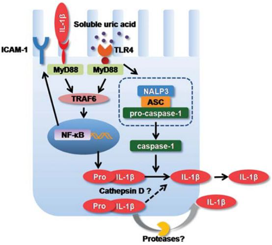 (3)晶體相關(guān)性腎病研究發(fā)現(xiàn)以含100ug/mL尿酸培養(yǎng)液培養(yǎng)腎小管上皮細(xì)胞發(fā)現(xiàn)TLR4 NLRP3、Caspase-1IL-1?表達(dá)的增加,予以TLR4的阻滯劑TAK242干預(yù)后NLRP3 Caspase-1IL-1的表達(dá)明顯減少,說明尿酸可通過TLR4激活NLRP3及下游焦亡信號(hào)因子,導(dǎo)致腎臟炎癥反應(yīng)及細(xì)胞焦亡。參考文獻(xiàn):Soluble uric acid increases NALP3 inflammasome and interleukin-1βexpression in human primary renal proximaltubule epithelial cells through the Toll-like receptor 4- mediated pathway.