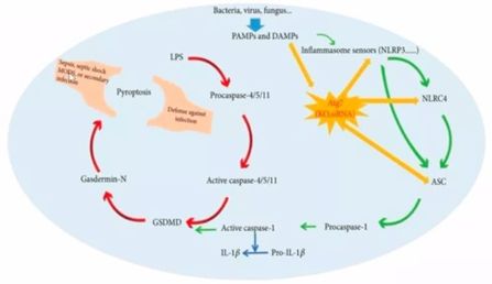 細胞焦亡主要依靠炎癥小體激活caspase家族的部分蛋白,使其切割gasdermin蛋白,激活gasdermin蛋白,活化的gasdermin蛋白轉位到膜上,形成孔洞,細胞腫脹,胞質外流,最終導致細胞膜破裂,細胞焦亡。細胞焦亡亦有經典通路與非經典通路之分。