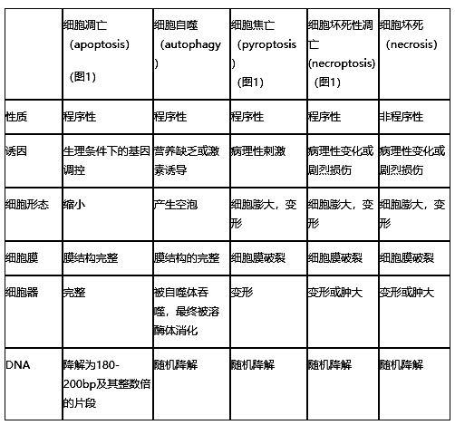 那么細胞焦亡和其他的細胞程序性死亡和非程序型死亡有什么區(qū)別呢?且看圖表詳解: