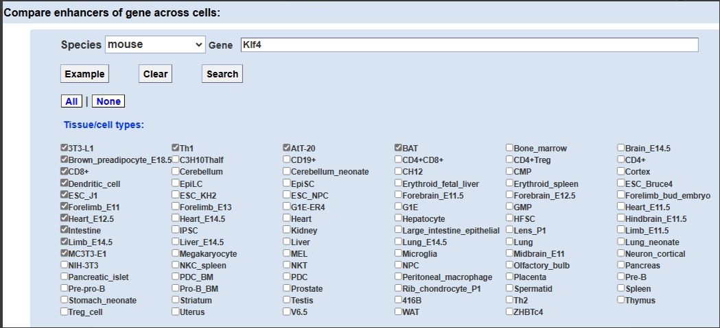該數(shù)據(jù)庫(kù)有多種檢索方式,支持直接輸入基因名稱(chēng)或者基因組特定區(qū)域,查看在該區(qū)域內(nèi)的增強(qiáng)子,同時(shí)還能比較增強(qiáng)子在不同細(xì)胞系中的表達(dá)。以鼠源基因klf4為例來(lái)演示如何在這個(gè)數(shù)據(jù)庫(kù)中預(yù)測(cè)增強(qiáng)子,在選框中選擇物種,選擇細(xì)胞或組織,輸入基因名稱(chēng),點(diǎn)擊search,跳轉(zhuǎn)到結(jié)果頁(yè)面。