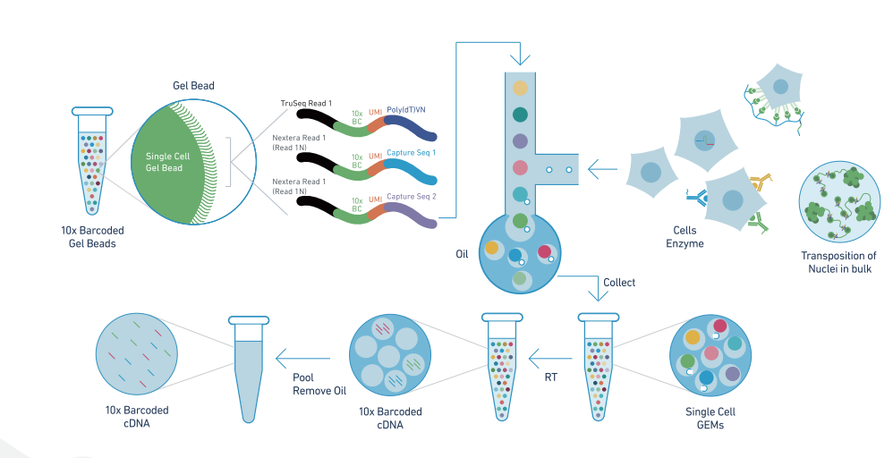 10x Genomics單細胞捕獲系統(tǒng)利用微流控,油滴包裹和Barcode標記等技術來實現(xiàn)高通量的單細胞捕獲及標記。每個凝 膠珠(Gel Bead),注入數(shù)百萬獨特的寡核苷酸序列,與樣品混合,樣品可以是單個細胞/細胞核,使用特征編碼技術(Feature Barcoding Technology)標記的細胞,用轉(zhuǎn)座酶處理的細胞核。接下來凝膠珠和單個細胞被油-表面活性劑溶液包裹,形成 GEMs,其作為單獨的反應囊泡,隨后凝膠珠溶解并且單個細胞被編碼的寡核苷酸序列所標記。然后將每個液滴中含有10x Barcode信息的產(chǎn)物混合,構(gòu)建標準測序文庫。待測序后,根據(jù)10x Barcode序列進行單細胞,單細胞核數(shù)據(jù)拆分,并利用10x Genomics提供的可特異性解析10x Barcode的分析軟件進行數(shù)據(jù)分析及可視化展示。