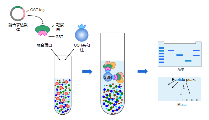 基本原理:將靶蛋白-GST 融合蛋白親和固化在谷胱甘肽親和樹脂上,作為與目的蛋白親和的支撐物,充當(dāng)一種“誘餌蛋白”,目的蛋白溶液過柱,可從中捕獲與之相互作用的“捕獲蛋白”(目的蛋白),洗脫結(jié)合物通過 SDS-PAGE 電泳分離,最后經(jīng)western blot或質(zhì)譜分析,從而證實(shí)兩種蛋白間的相互作用;