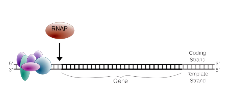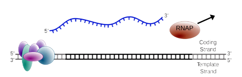 起始:RNA聚合酶對轉(zhuǎn)錄起始位點上游的DNA序列進(jìn)行辨認(rèn),同時打開DNA雙螺旋結(jié)構(gòu),依賴轉(zhuǎn)錄因子結(jié)合啟動子形成復(fù)合物。