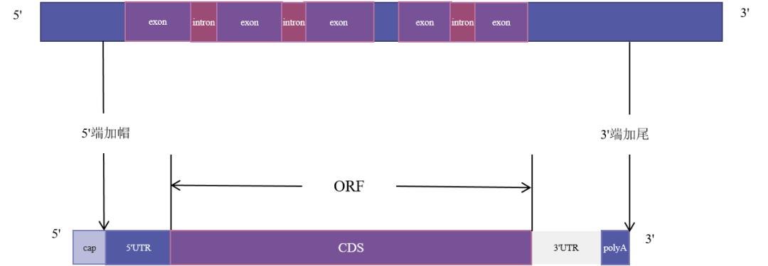 其結(jié)構(gòu)包括:5’帽子結(jié)構(gòu)、5’UTR區(qū)、CDS區(qū)、3’UTR區(qū)、polyA尾巴。那各個區(qū)段的含義又是如何,接下來我們一個個來解釋。