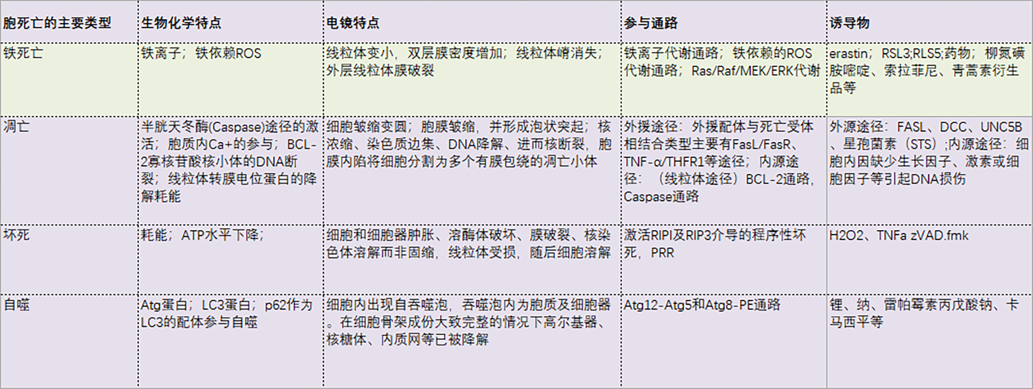 不同細胞死亡方式特點對比