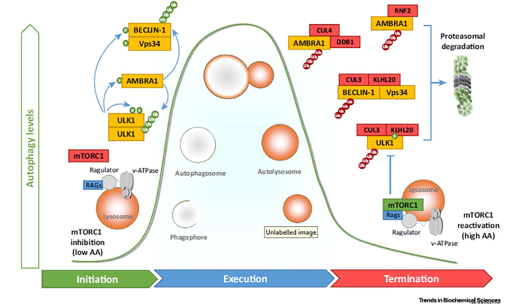 營養(yǎng)缺乏導(dǎo)致mTORC1失活,從溶酶體膜游離,激活許多翻譯后修飾促進(jìn)ULK和VPS34復(fù)合物的活化(即自噬起始)。一旦ULK和VPS34復(fù)合物被激活,自噬的執(zhí)行程序被允許(即自噬的執(zhí)行)。自噬終止:由E3泛素連接酶執(zhí)行的ULK和BECLIN-1活性復(fù)合物介導(dǎo)完成。此外,由溶酶體消化產(chǎn)生的氨基酸重新激活mTORC1,它能夠反過來抑制自噬發(fā)生。(來自綜述:Emerging Mechanismsin Initiating and Terminating Autophagy)